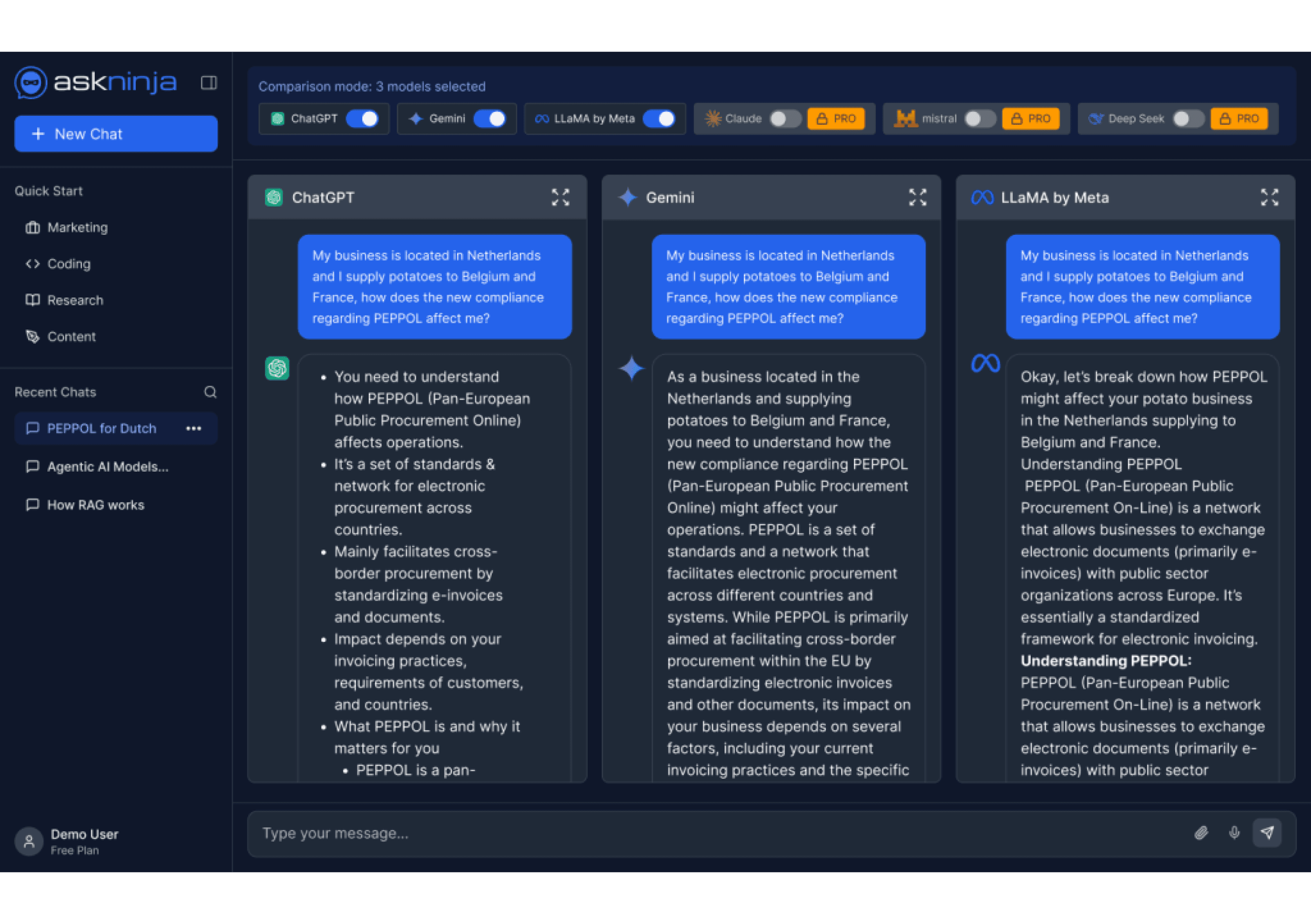 askninja AI is designed with enterprise privacy at its core. Your prompts and documents are never shared or used to train external AI models. You get the freedom to explore and compare multiple AI models with the confidence that your data remains secure and in your control.