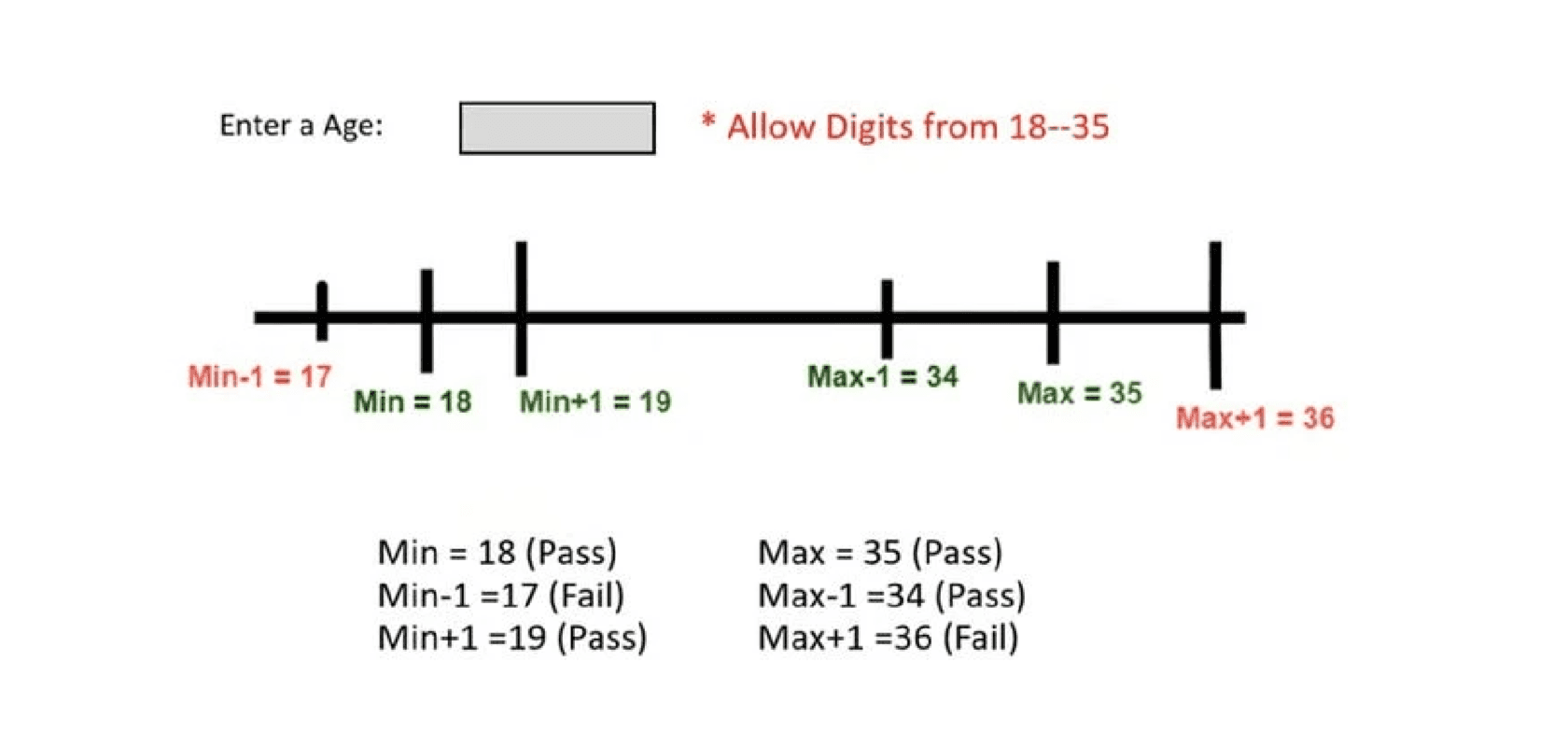 You test the minimum and maximum values of a given range, as well as the values just inside and outside the boundary.