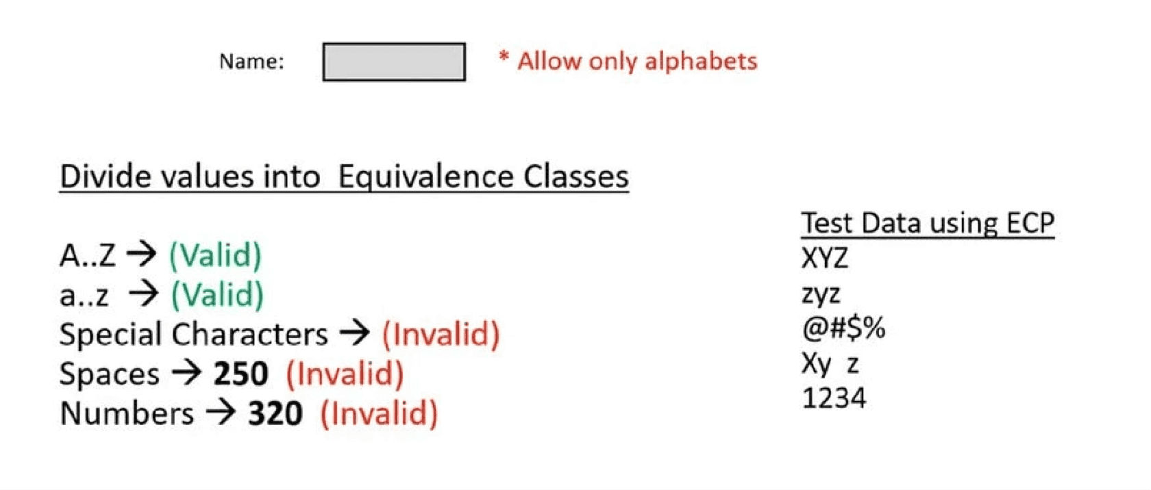 Valid Equivalence Class: Group of values that should work correctly.